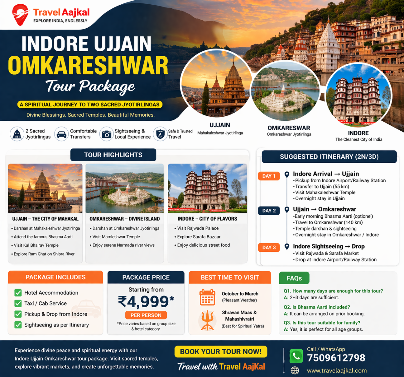 If you’re planning a spiritual and cultural journey in Madhya Pradesh, the Indore Ujjain Omkareshwar tour package is one of the best options. This tour covers two of the most sacred Jyotirlingas in India—Mahakaleshwar Jyotirlinga and Omkareshwar Jyotirlinga—along with the vibrant city of Indore.